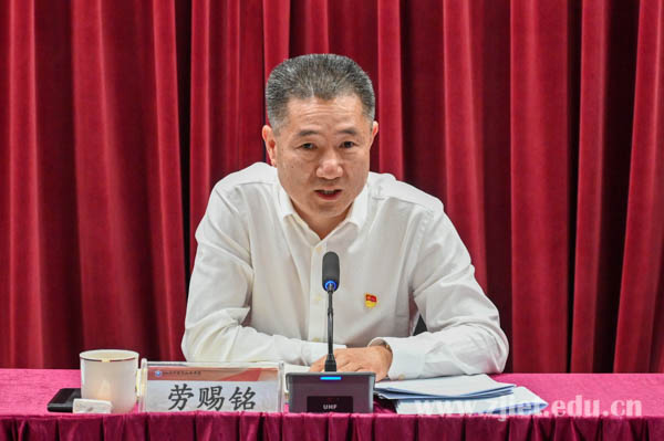 会上,劳赐铭结合深入学习习近平总书记在学习贯彻习近平新时代中国特色社会主义思想主题教育工作会议上的讲话精神,对学校主题教育进一步走深走实提出了工作要求,对学校当前作风建设推进情况进行了剖析和再部署,并围绕加强保密工作进行专题授课。